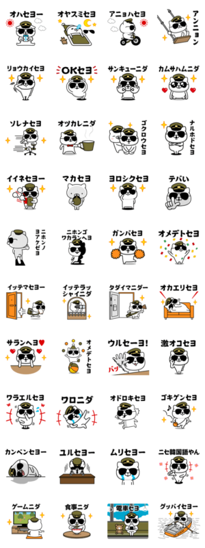 偽韓国語、ハングル語の日常会話で毎日使える挨拶系スタンプです。軍人、軍隊、自衛隊、陸軍、ミリタリー、アーミー、兵隊をモチーフにした猫のスタンプです。
