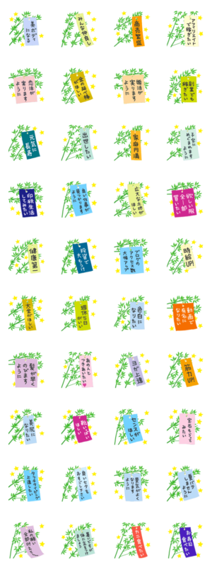 「七夕・暑中見舞い」の続編。たなばたのお願いがいっぱいあるよ。笹の葉に願いを込めて楽しくお願いしちゃおう!季節を楽しむ夏らしいスタンプ。Y.Toyama より発売
