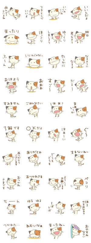 三毛猫のミーニャ。「ほっこり」「まったり」から「ねむいなぁ」まで。力の抜けたゆるい言葉がいっぱい。ちょっとやる気が出ない時にも。家族、学校、お仕事でも。