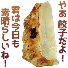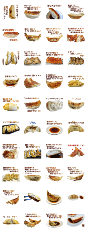 餃子が褒め言葉を言うスタンプです。褒め言葉は言う方も言われる方も幸せになる最強の言葉!飯テロ。ぎょうざ、ギョウザ、ギョーザ。実写・写真面白い食べ物スタンプ。竹野チコ より発売