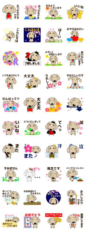 字がはっきりしていて見やすく、敬語で使いやすいスタンプ。ダックスフンド、犬好きの方へ。ゆるいスタンプ。春編で、プラス入学、母の日、エイプリルフール、こいのぼり