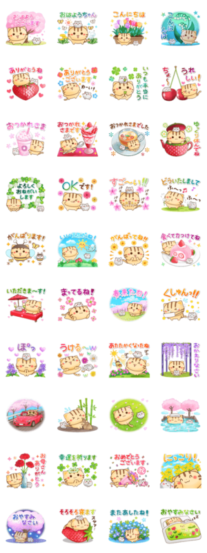 いつも仲良しネコちゃんとハムちゃんの春バージョンスタンプです。桜、いちご、春のお花をお届けします。すみれぐみ より発売