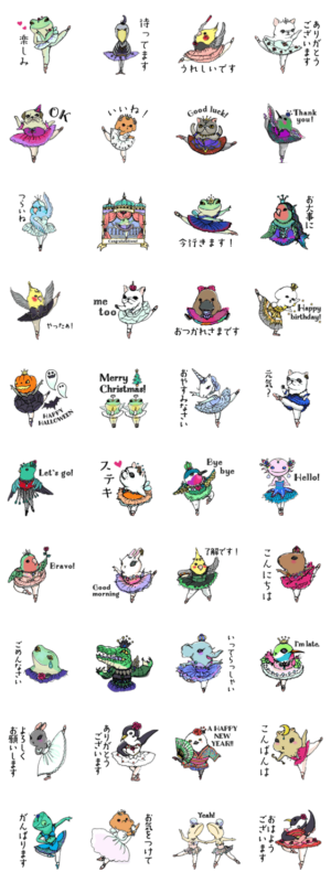 煌びやかな衣裳を着た動物たちのバレリーナスタンプです。日常会話からイベントまで使える豊富な40種類。