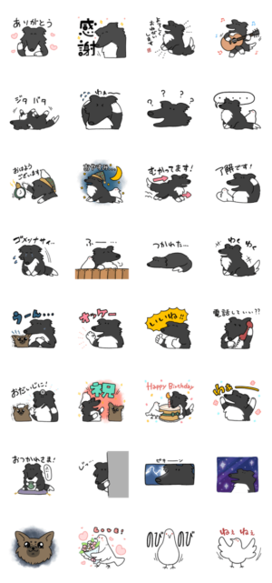 黒いシェルティのネロリとおともだちのチワワのとハトのスタンプです。fukuyamaru より発売
