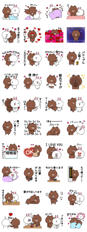 カップルで使える、こちらは彼氏用くま(ブラウン)のスタンプです。彼女用うさぎ(コニー)もあるので、恋人はもちろん、ご夫婦でも使ってみてね!今回もサリーもいるよ! ※BROWN & FRIENDS をみんなでつくろう!キャンペーン参加スタンプですユウィズ より発売