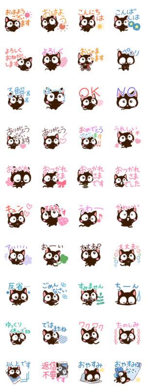 『小さい黒猫スタンプ』から、ぺんで描いた文字の、毎日便利なクロネコスタンプです。基本的なあいさつや、よく使う言葉を集めました。くろねこ好きな方にぜひ。【かたこ】