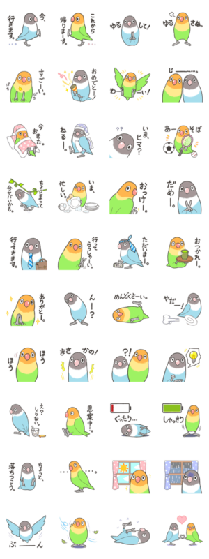 ブルーボタンインコとヤマブキボタンインコがお送りするゆるーいスタンプです。ろく。 より発売