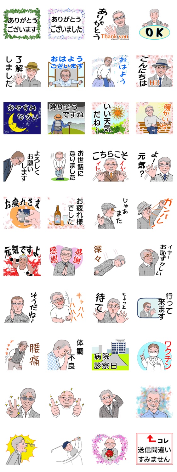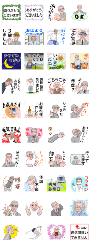 大人の男性挨拶。ミドル、シニアの紳士、お父さん、おじさん、おじいちゃんへ。上司、目上の方にも送れる。ふざけ過ぎない、可愛い過ぎないスタンプ。敬語丁寧語入です。mitch より発売