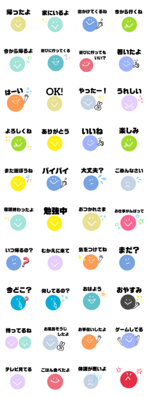 小学生、中学生が使いやすいスタンプです。お留守番の親へのスタンプやお友達にも。シンプルなスマイルのイラストayumini* より発売