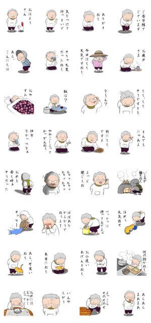 昔ながらの日本のおばあちゃんスタンプ第2弾です。あなたが優しいおばあちゃんになったつもりで友達を励ましたり慰めたりするのに最適なスタンプです。
