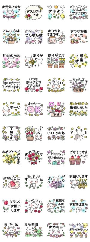 「贈るスタンプ*感謝に花を添えて」をさらに文字大きめに見やすくリメイク。日常よく使う言葉だけを集めた敬語多めの便利な40個。ほっこり癒されそうなスタンプです。