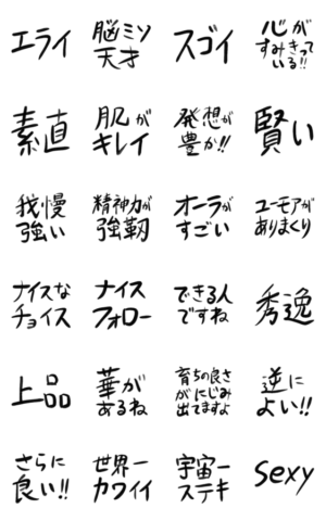 あえて強調して言いたいことを飛び出すざっくり筆文字で表現するスタンプです。褒める、ホメる、元気づける、応援する