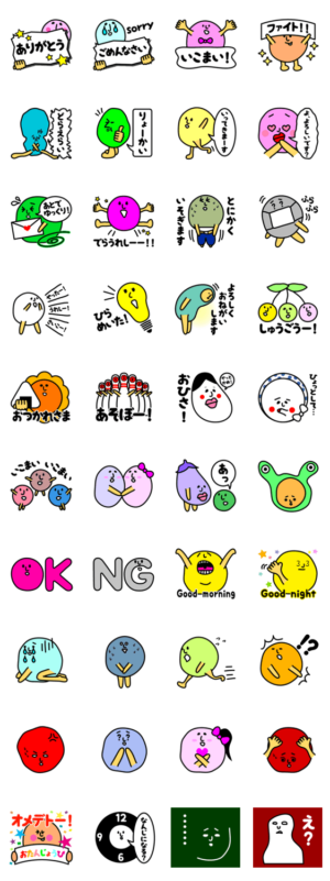 カラフルな丸い玉達が色んな表情と言葉でメッセージを伝えます。よく使う言葉を集めた大きく見やすいスタンプです。
