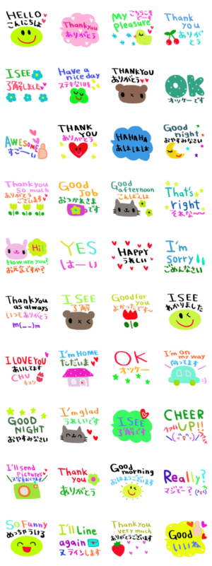 日本語英語韓国語タイ語中国語ございます。絵文字や着せ替えもございます。日本語 日本語&英語スタンプnenerin より発売