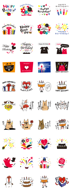 お誕生日をお祝いできるお洒落なスタンプ!ポップなもの、手描きのもの等、数種類のタッチで作成。プレゼント、ケーキ、花束、犬、猫など★ぜひ使ってください!