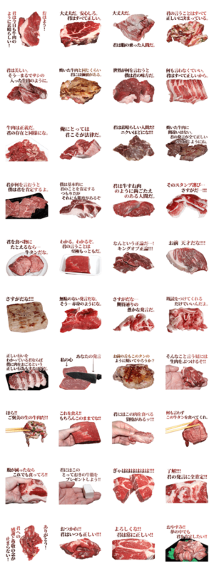 全てを肯定する牛肉のスタンプです。とにかく相手を肯定しましょう。肯定すればみんな幸せ。生肉、焼肉、ビーフ。イエスマン。実写・写真面白い食べ物スタンプシリーズ。竹野チコ より発売