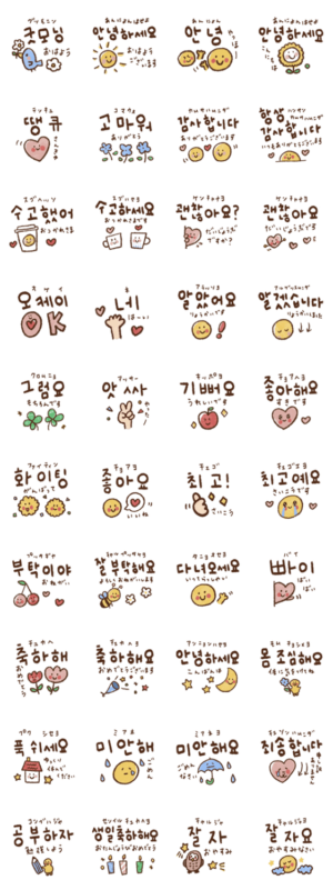 あいさつなど日常で使いやすい韓国語を集めたシンプルなスタンプ。 敬語多めなので大人女子(オンニ)とのやりとりにもオススメです。 ハングルの読み方と日本語訳付き。なからん より発売
