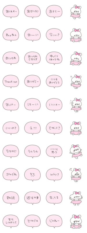 組み合わせて使えるスタンプです。男の子バージョンもあるのでそちらとの組み合わせもOK!同じ言葉でも違う表現表情で返信したい時に便利!ピンク好きな方にもおすすめ!