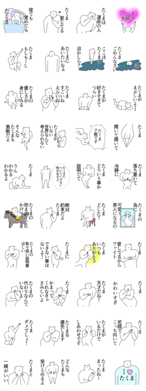 たくまくんに送れる、大好きな気持ちと誉め言葉をシュールに伝える。彼氏や友達や家族へ。自己肯定高めで本人も名前スタンプとして使えるかも。タクマ、琢磨、拓真など。