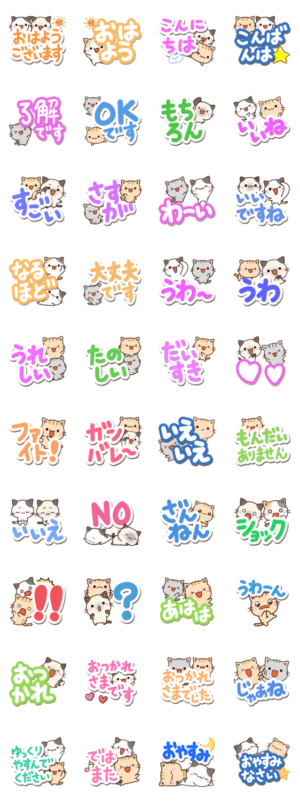 『5匹のちび猫』のやさしい挨拶編。『ちびミケ』の三毛猫や、『ちびシャム』のシャムネコ等の、ねこスタンプ。大きな文字で選びやすいネコスタンプです。【かたこ】かたこ より発売
