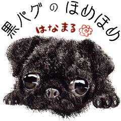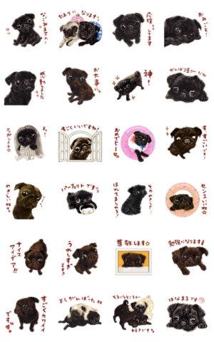 絵本作家 金澤麻由子の癒しかわいいスタンプ。絵本『ぼくぱぐ』のキャラクター、黒パグが褒めて褒めて褒めまくります!ほめ言葉をどんどんプレゼントしましょう♪