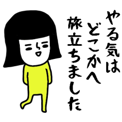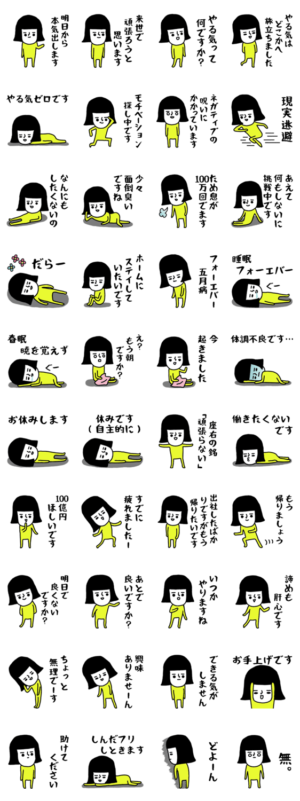 毎日頑張って働く女性の為のビジネスシーンや職場の人へ使える敬語のスタンプ(無気力ネガティブやる気ない編)。黄色全身タイツのちょいシュールOLがメッセージをお届け。