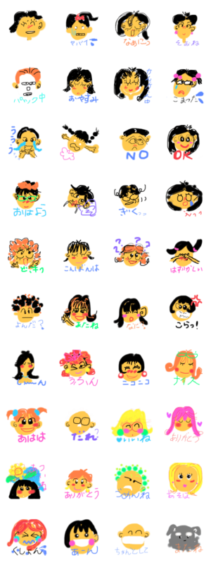 指で描いたスタンプ。短いコメントで毎日使える。顔の表情も楽しめるよ♡SASAKI AKIKO より発売
