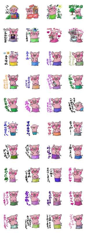 豆金豚牧場のキャラクター、ブタのポーくんのスタンプ第8弾です。新しい環境に慣れ始めた5月、久々に連絡する友人や職場の同僚などに使えるスタンプを作りました。