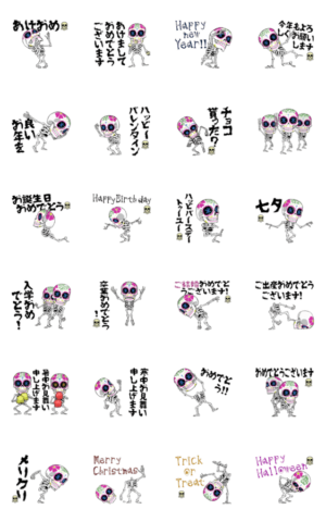 ハロウイン、クリスマス、正月、出産、入学、結婚、七夕、冬、夏、春、秋、お誕生日など季節によって送りやすい言葉の骸骨スタンプです。ゴスやメキシコ好きな人も是非。