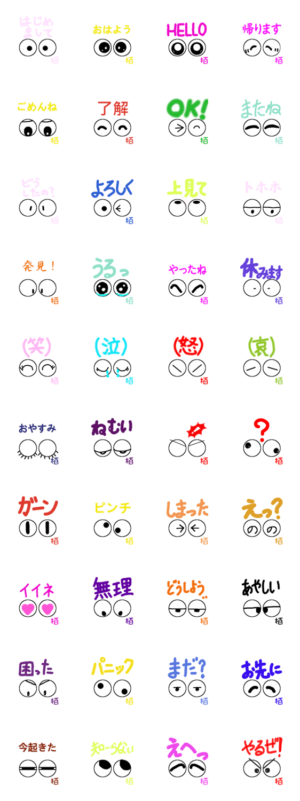 かわいい目玉の日常会話・あいさつ・気持ち 了解 はじめまして おはよう HELLO 帰ります ごめんね またね どうしたの? よろしく 上見て OK トホホ 今起きた