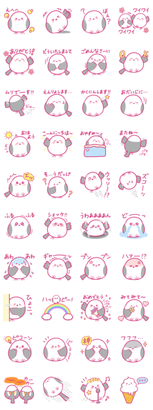 とってもかわいいシマエナガを 色々な場面で使えるスタンプにしました! ・デザイン/文字:しーちゃん ・イラスト:こつばんこつばん と しーちゃん より発売