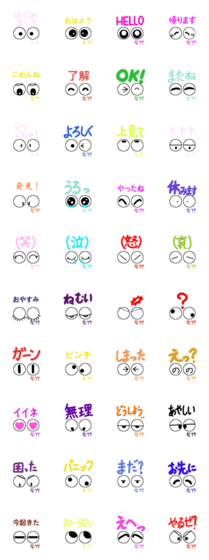 かわいい目玉の日常会話・あいさつ・気持ち 了解 はじめまして おはよう HELLO 帰ります ごめんね またね どうしたの? よろしく 上見て OK トホホ 今起きた