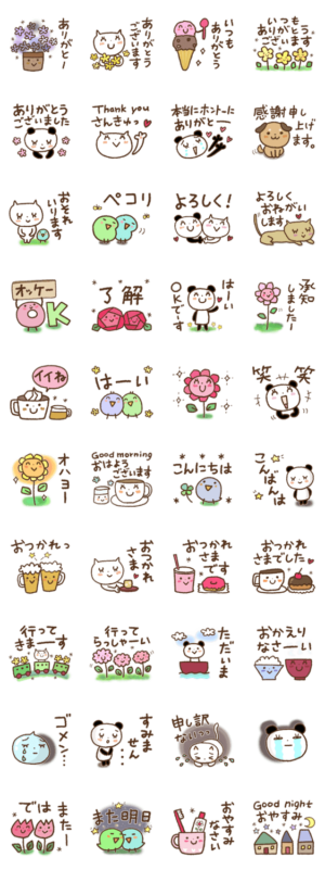 日常の基本の挨拶やお礼の言葉のバリエーション40個。文字が大きく見やすいので、誤送信も防げます。送る相手を選ばないシンプルなイラストです。