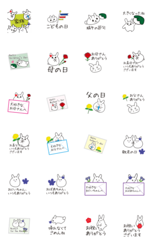 こどもの日、母の日、父の日、敬老の日のうさぎのふにゃらび家族アニメーションスタンプです。こどもの日、母の日、父の日、敬老の日に使えます。