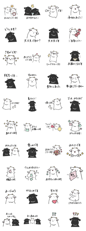 ゆるくてまっしろ、たまにお手紙を食べちゃうやぎさんの仲間たち第3弾、敬語のスタンプです。くろやぎさんもいます。ao より発売