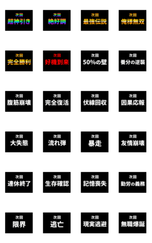 金文字・レインボー文字の激アツ予告からやる気0の無気力予告まで、使える予告たっぷりの欲張りセット。 激熱/五月病/社畜/連休/ガチャ/ソシャゲ/ギャンブル/面白い/ネタとりてん より発売