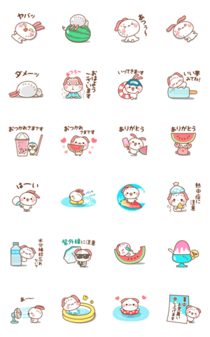 猛暑の夏に便利な「たれ耳うさぎ」のアニメーションスタンプです♪ お友達と夏の会話を楽しんでくださいね♫