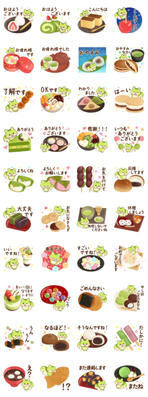 和菓子、和風スイーツと抹茶色のリス。日常会話で使いやすい言葉を集めたスタンプです。毛玉ピストル より発売