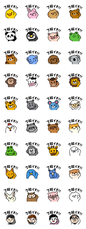 いろんな動物がOK(りょうかい・承知)する手書き風スタンプです。(ねこ・リス・ぶた・くま・うさぎ・ハダカデバネズミ・おじさん)ミミンヌモコ より発売