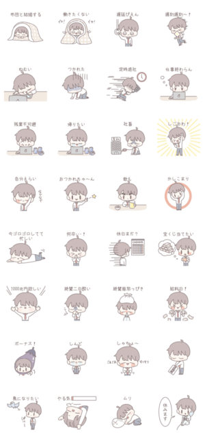 働く男性向けのゆるめのスタンプです。関連用語:男の子/あいさつ/サラリーマン/かわいい/仕事/五月病/やる気ない/働きたくない/カップル/友達/会社員/無気力