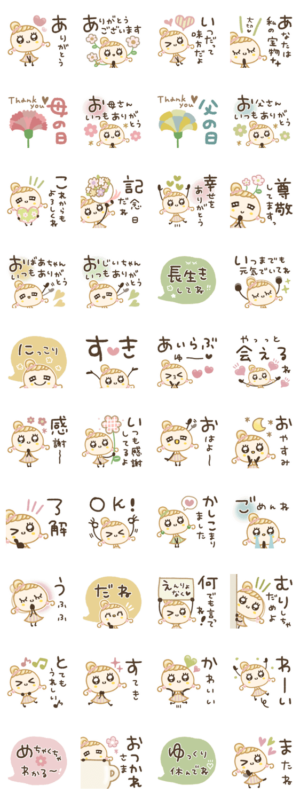 ほぺ美ちゃんシリーズ◎大切な家族や友人、恋人などに送りたいメッセージが詰まったスタンプです♪小さな幸せ/感謝あさごぱん より発売