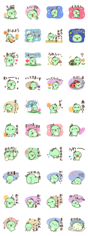 ちいさいモンスターのナチュラルガーリースタンプ。緑のカッパ色の怪獣です。UMAや河童、チュパカブラ、恐竜、かいじゅう好きの方にぜひ。【かたこ】かわいい/北欧風かたこ より発売
