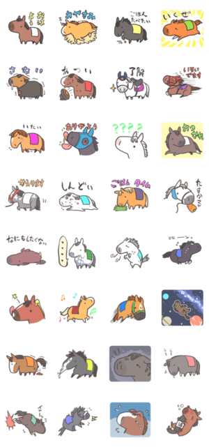 UMAのスタンプです。もちもちデフォルメされた馬たちです、サラブレッドの毛色オンリーです。