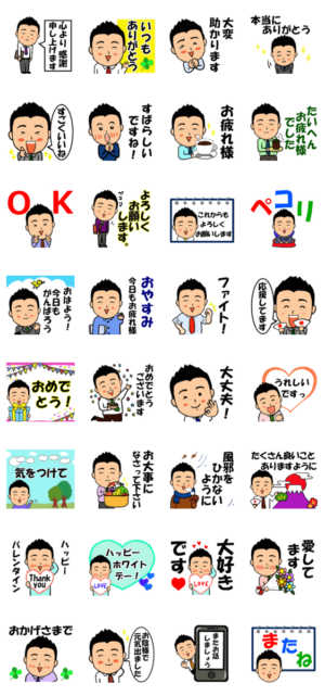こちらは「笑顔のサラリーマン」シリーズのめがね無しバージョン。今回は気持ちが伝わるスタンプ。見やすいデカ文字挨拶付き。バレンタインやホワイトデーにも♪男性会社員