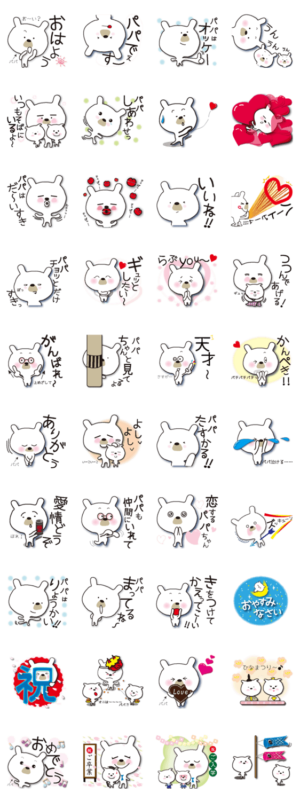 ぱぱ(父)から子どもやママへの愛情たっぷりのやさしいほめ言葉スタンプ。毎日の子育てに活用してね。春行事の節分,バレンタイン,雛祭り,卒業,入学,子供の日のお祝いに。kinopio より発売