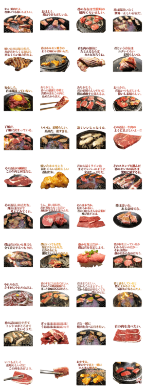 焼き肉がすべてを肯定するスタンプです。とりあえず肯定しておけば万事丸く収まります。みんな幸せ。生肉、やきにく、ヤキニク、牛肉、ホルモン。実写面白い食べ物スタンプ竹野チコ より発売