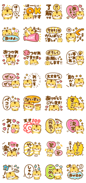 毎日の会話で使いやすい言葉やリアクションがぎゅっと詰まった虎さんスタンプです。ふきだしもいっぱい!