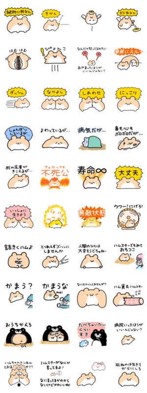 絶対に死なないというハムスターの仕草や表情がかわいらしく、励まされるスタンプです。