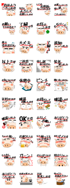 まゆ毛が特徴的な愛らしいブタのデカ文字のスタンプ。職場で毎日よく使う言葉を揃えました。敬語もやさしい言葉もすぐに返せる言葉も。ちょっと、社会人向き。ぶひっ。