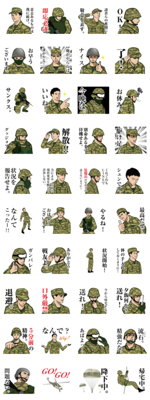 スタンプ説明文 陸上自衛隊のLINEスタンプ第6弾です。陸自の日常でよく使用される用語を特集しました。whiterain より発売
